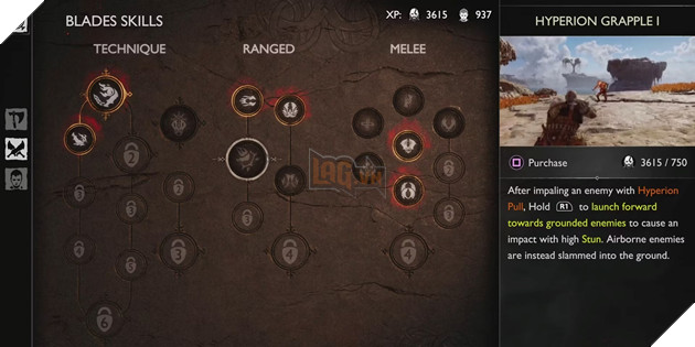 Blades of Chaos 에서 플레이어가 우선시해야 하는 마지막 초기 게임 기술은 Kratos 의 원거리 옵션 을 크게 향상시킬 수 있는 Hyperioan Grapple I 입니다. 잠금을 해제하면 갈고리에 걸린 적을 자신 쪽으로 끌어당기는 대신 Kratos 는 매우 높은 기절 능력으로 적을 향해 돌진합니다. 적들이 공중으로 던져지는 동안 적에게 갈고리로 걸리면 R1 버튼을 누르고 있으면 Kratos 가 적들을 땅에 내리쳐 상당한 피해를 입힐 수 있습니다.