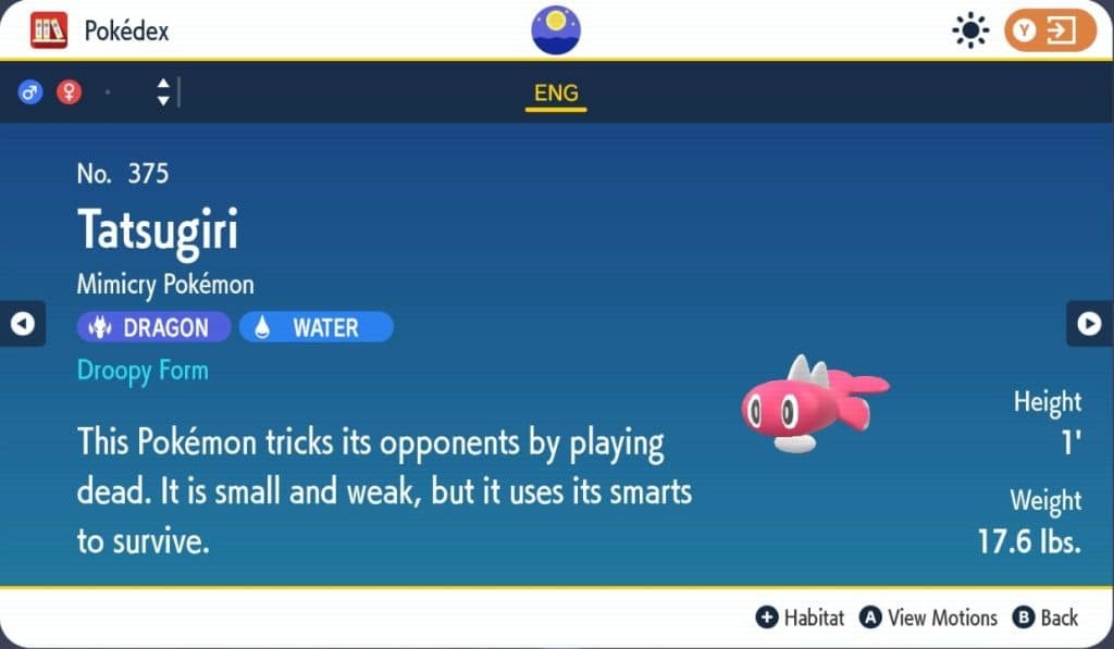이 형태의 Tatsugiri는 다른 색상과 패턴을 가지고 있어 상대방이 자신이 죽었다고 생각하도록 속이고 생존을 위해 영리함을 사용합니다.