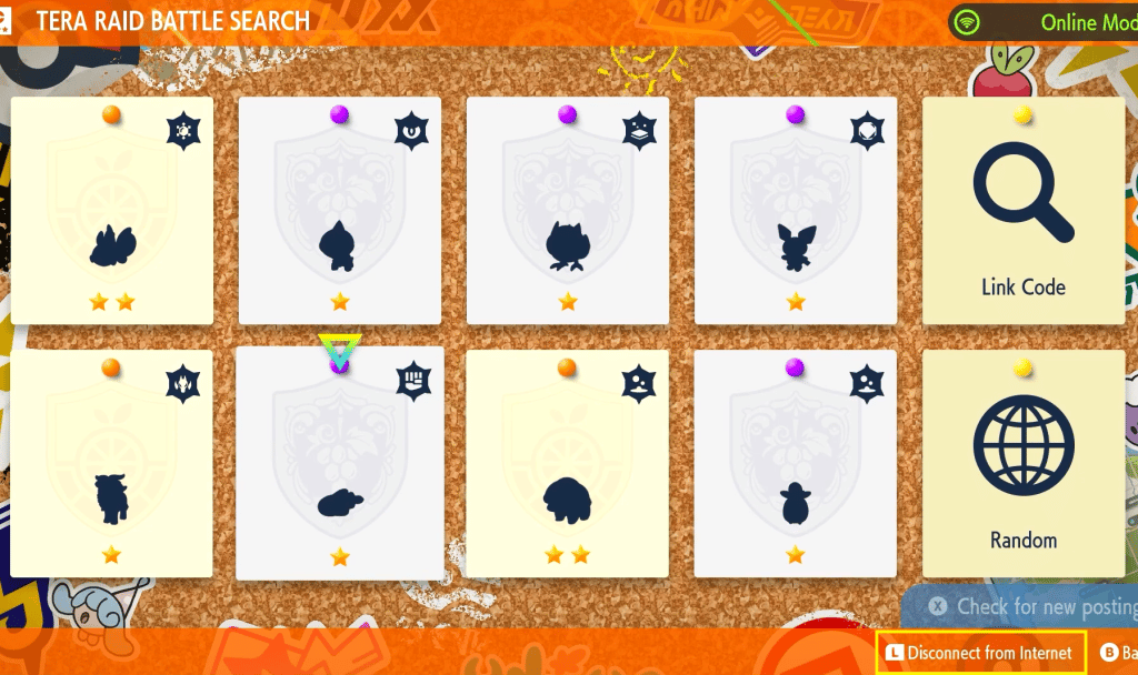 참고: 이벤트 테라레이드에는 노란색 이벤트 카드가 있으며, 테라레이드 준비 화면 또는 테라레이드 전투 검색 메뉴에서 볼 수 있습니다. 온라인에서 다른 플레이어와 Tera Raid Battles에 참여하려면 인터넷에 액세스하고 Nintendo Online 구독도 필요합니다.