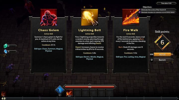 - 연쇄 번개 : 무작위 적에게 번개를 던져 170의 피해를 입히고 혼란을 적용한 다음 가능한 경우 근처의 추가 대상 5명에게 점프합니다.