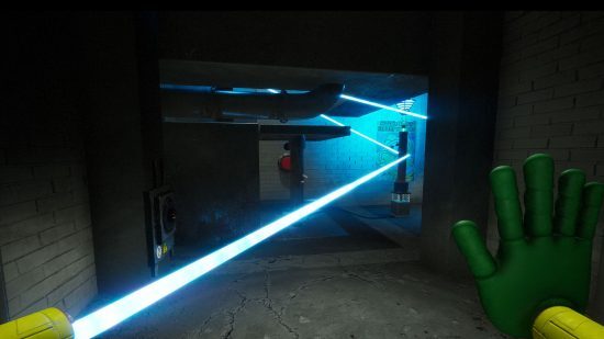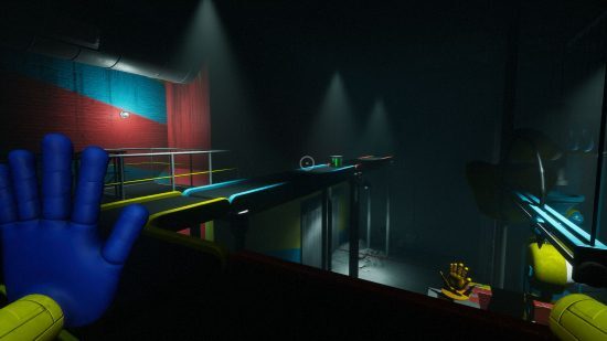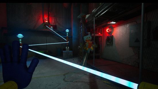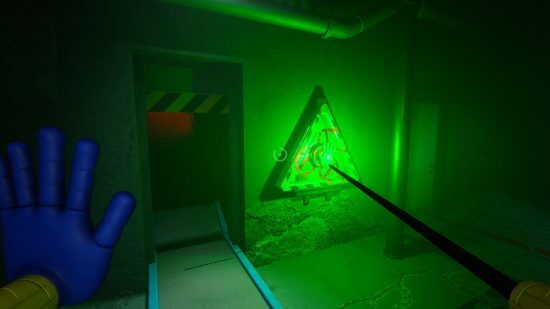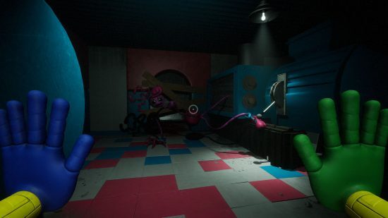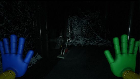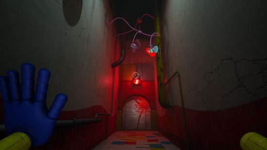 방을 나와 복도를 따라가면 게임 스테이션이 있습니다. 문 위의 스위치에서 빨간 손을 쏘고 – 오 안돼! Mommy Long Legs가 여기 있고 그녀는 당신의 빨간 손을 훔칩니다. 엉덩이가 아프다.