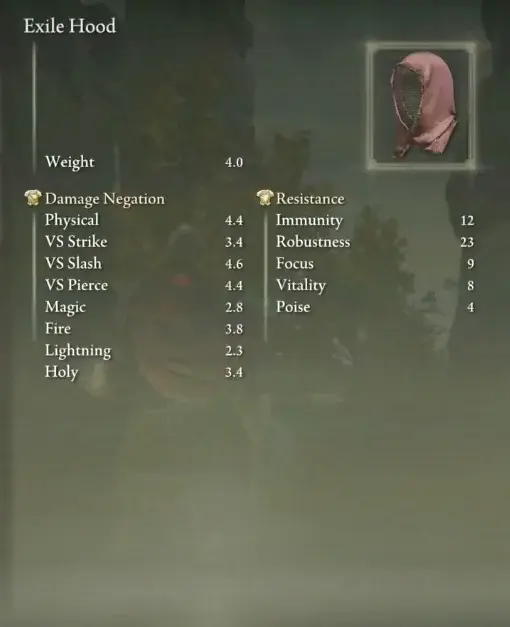 세트 자체에는 또한 HP가 특정 지점 아래로 떨어지면 플레이어를 치유하는 패시브가 있으며 집중 및 포이즈 저항과 함께 타격, 마법, 신성, 관통 및 물리적 손상 부정이 증가합니다. 아래의 피해 무효화 및 저항 수치를 살펴보십시오.