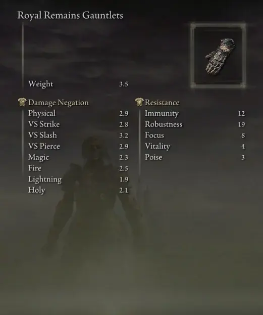 Fire, Strike, Slash 보호 및 Elden Ring의 Gauntlet 보호를 받는 동안 무효화되는 다른 유형의 원소 손상을 경험하게 됩니다. 건틀릿을 장비할 가치가 있는지 아래 통계를 통해 확인할 수 있습니다.