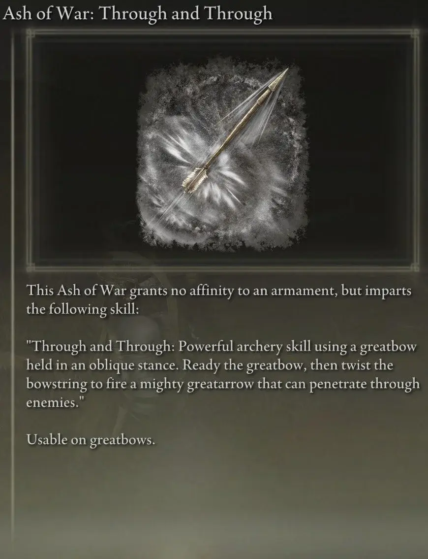 이 Ash of War는 더 가벼운 활을 위해 활로 구현하여 데미지와 공격 속도를 크게 향상시킬 수 있습니다.