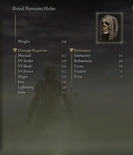 Magic, Holy 및 Light와 같은 모든 유형의 손상으로부터 플레이어를 보호하고 Strike, Slash 및 Pierce 손상으로부터 보호하는 것을 목표로 합니다. 순중량은 4.6으로 헬멧을 무거운 헬멧으로 추가하지만 착용하기 쉽습니다. 다음은 피해 무효화 및 저항입니다.