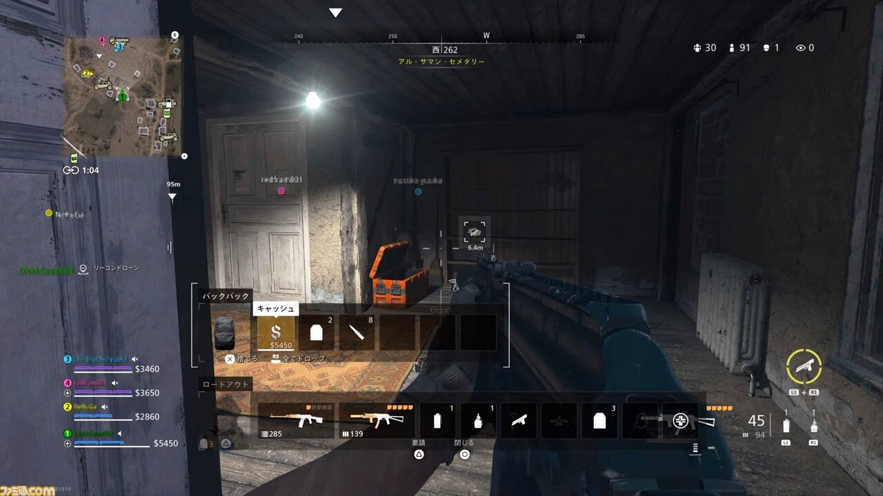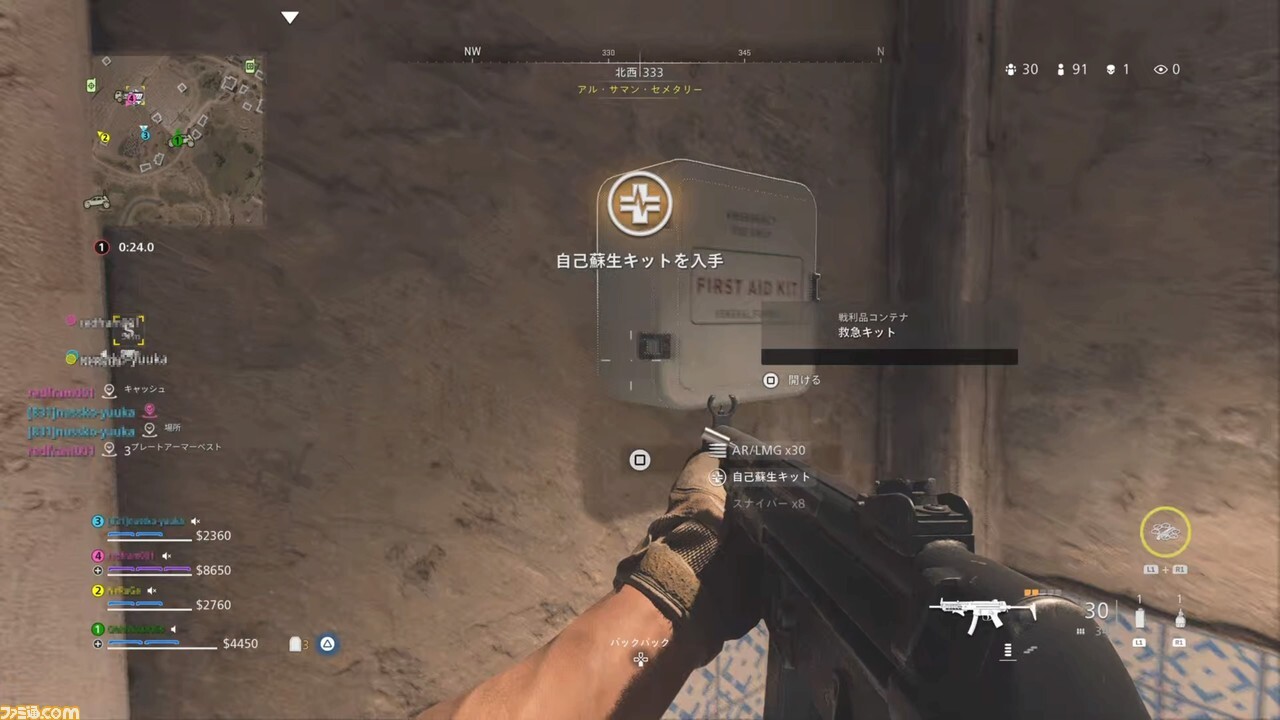 적이 근처에 없을 때는 주변 건물 등을 물색. 무기 조달도 중요하지만, 플레이어의 내구력을 올리는 "아머 플레이트"와 그 장착 수를 늘릴 수있는 "3 플레이트 아머 베스트"는 가능한 한 빨리 확보하고 싶다. 자신이 다운해 버렸을 때, 아군의 도움이 없어도 소생 가능한 “자기 소생 키트”도 입수할 수 있으면, 생존율은 더욱 높아진다.