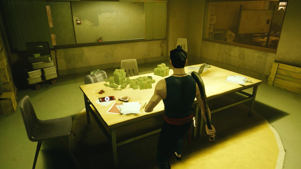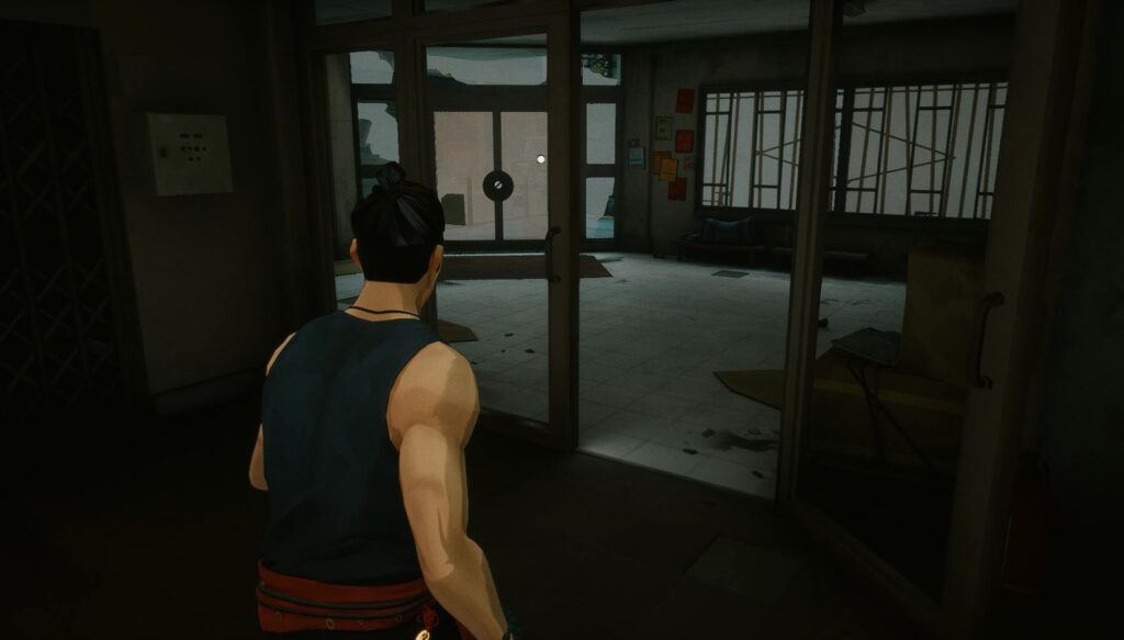 왼쪽 출입구로 이동하여 모퉁이를 돌면 오른쪽으로 돌고 열린 유리문을 통해 계속 직진하여 잠긴 이중문을 확인하십시오. 당신은 당신의 첫 번째를 볼 수 있습니다보드 아이템문에,해골 편지. 그것을 잡고 돌아서십시오. 이 잠긴 문은 보물을 모은 후 이용할 수 있는 지름길이 될 것입니다.열쇠 묶음나중에 이 수준에서. 놓치지 않도록 하세요.신사이 지름길을 택할 때 처음 3명의 깡패를 지나서 하역장에서.