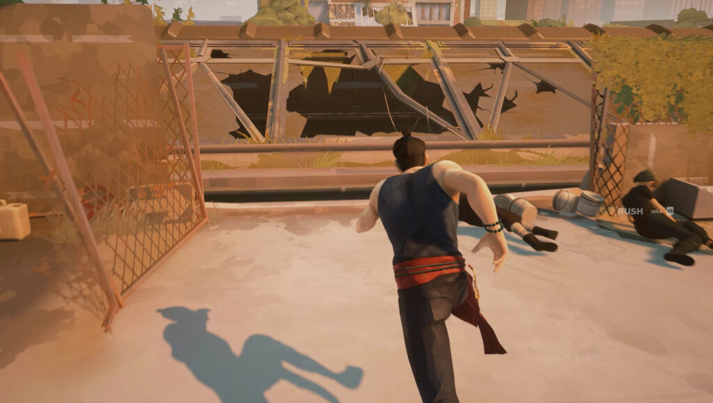 업그레이드를 손에 들고 나면 돌아서서 벽을 타고 올라가십시오. 올라갈 수 있는 지역은 종종 세로로 된 흰색 긁힌 자국으로 표시됩니다. 지붕에 매달려 있는 적을 쓰러뜨리십시오. 그런 다음 처음 지붕에 올랐을 때 오른쪽에 있던 부서진 지붕을 향해 전력질주해야 합니다.