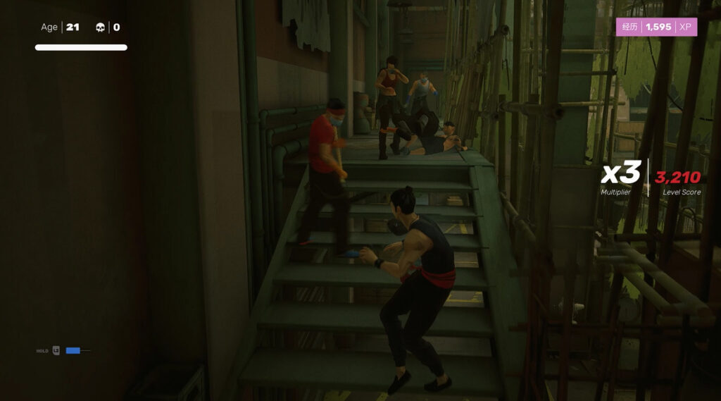 + 적들이 너무 가까워지면 뒤로 피하는 방향. 첫 번째 적에게 병을 던지고 빠르게 제거하십시오. 여기는 벽이 너무 가깝기 때문에 패링한 다음 밀어(