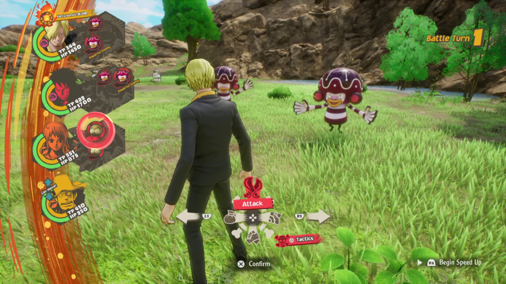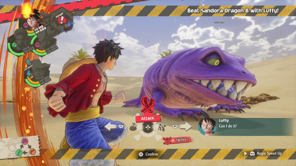 One Piece Odyssey는 네 명의 승무원이 일반적으로 다양한 유형의 적과 싸우는 턴 기반 전투 시스템을 제공합니다. 무작위 할당 때문에 여기에서 위치 지정이 매우 중요합니다. 각 캐릭터는 공격 또는 기술과 같은 유형에 속하며 현재 전투에 적합한지 평가하는 것이 중요합니다. 실제로 전투 중에 남아 있는 승무원 사이를 전환할 수 있으며, 전투에 더 적합할 수 있는 능력을 활용합니다.