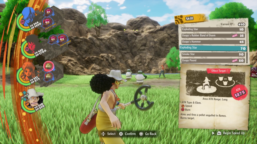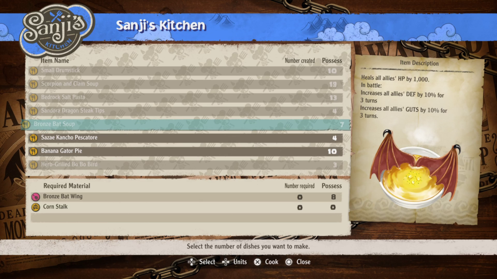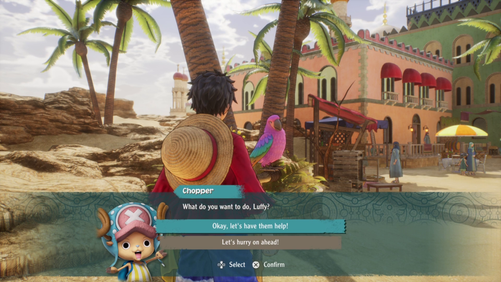 이러한 캐릭터별 능력은 순회에만 국한되지 않고 탐색에도 적용됩니다. Sanji는 요리사이며 그와 함께 나중에 다른 항목을 요리하는 데 사용할 수 있는 숨겨진 재료를 찾을 수 있습니다. 마찬가지로 Usopp는 새총에 접근하여 일반적으로 접근할 수 없는 세계 각지의 숨겨진 아이템을 노크하는 데 사용할 수 있습니다. Nami는 환경에서 돈을 감지할 수 있고 Chopper는 지형의 작은 틈새에 들어갈 수 있습니다.