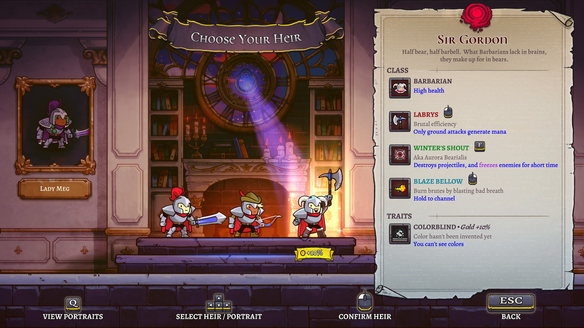 Rogue Legacy 2 는 영웅들과 그들의 차이점을 축하합니다. 모든 새로운 상속인은 로그라이트 실행에 고유한 풍미를 부여하여 두 번의 외출이 동일하지 않도록 합니다. 한 Valkyrie는 피자 부메랑을 사용하여 적을 베어버릴 수 있고(lol), Ranger 후손은 엄청난 강도로 플랫폼 사이를 이동합니다. .