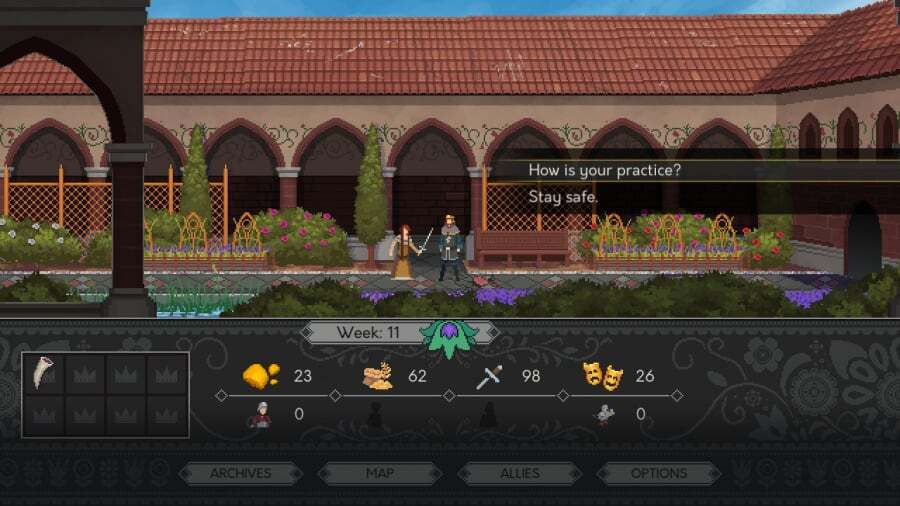 매일의 수술을 마치면 성 주변을 자유롭게 돌아다니며 더 많은 개인적인 문제를 처리할 수 있습니다. Yes, Your Grace의 국내적 측면은 더 강력한 요소 중 하나입니다. 싸움을 벌이는 두 큰 딸 사이에서 중재하고, 우울한 상태의 맏딸과 이야기하고, 막내의 공상 비행에 탐닉하는 것은 그다지 중요하지 않을 수 있지만, 이 모든 순간은 스토리의 기반이 되고 게임의 픽셀 아트 캐릭터를 더 관련성 있게 만드는 역할을 합니다.