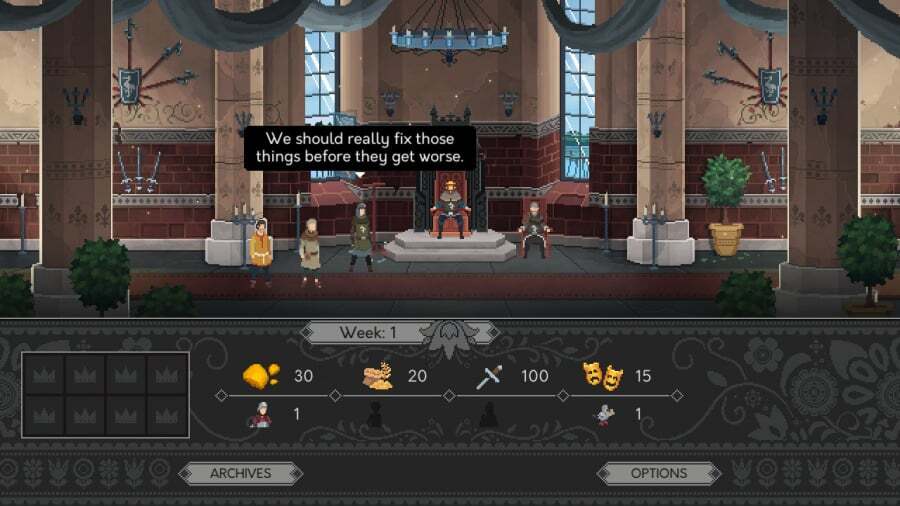 우리는 게임의 핵심에서 Reigns와 같은 시스템을 언급했지만 바이너리 내러티브 선택을 통해 감소하는 리소스를 다른 리소스와 대결하는 것처럼 간단한 경우는 거의 없습니다. 매일 하루는 왕좌의 방에서 주제, 여행하는 상인 및 방문 고위 인사의 요청을 처리하는 것으로 시작됩니다. 이러한 질문은 종종 돈이나 물품으로 해결할 수 있지만 파티에 장군, 마녀 또는 사냥꾼을 빌려야 할 수도 있습니다.