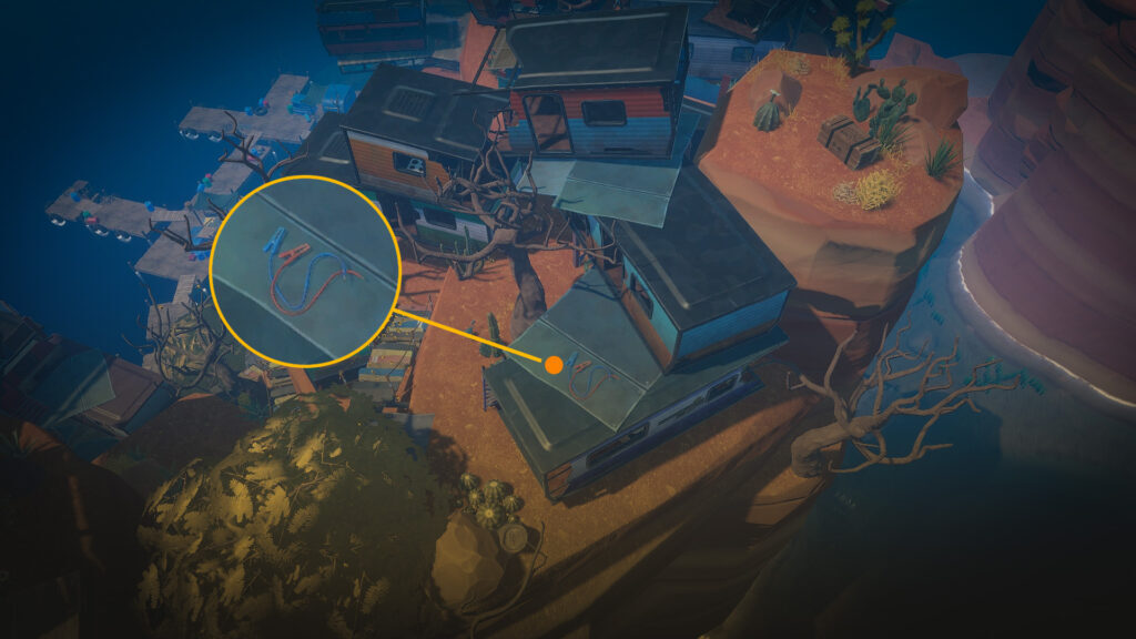세 번째이자 마지막 것도 산 정상에 있지만 이번에는 정상에 붉은 깃발이 달린 우뚝 솟은 트레일러를 타고 올라가야 합니다. 세 번째 배터리 충전 부분이 있는 3트레일러 컴파운드 바로 뒤에 있는 검은색 하우징 유닛을 찾을 때까지 타워에 인접한 나무 다리를 통과합니다.