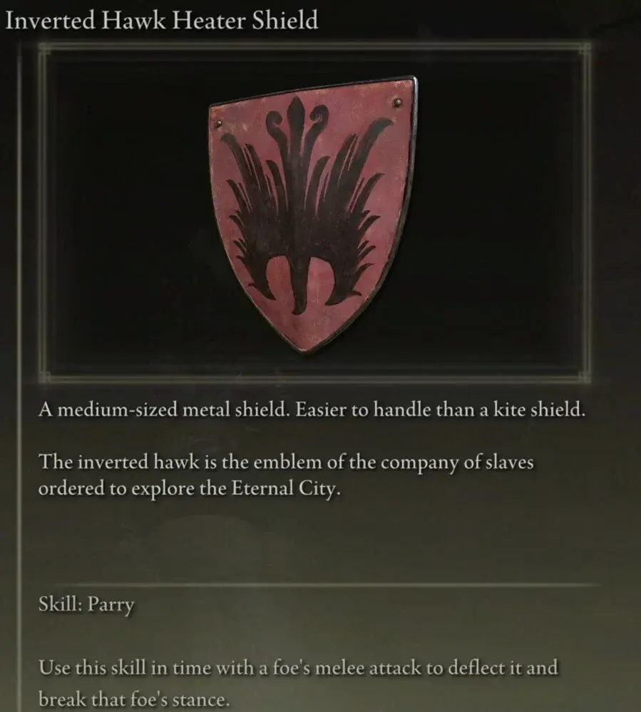 방패는 불길한 균열을 묘사하도록 설계되었습니다. 이 방패는 집중력을 높이는 데에도 좋으며 적을 노려보아 그들의 마음에 두려움을 심어준다고 합니다. 방패에는 패리 기술이 있으며 마법, Ashes of War 또는 마법을 주입하여 전투에서 우위를 점할 수 있습니다.