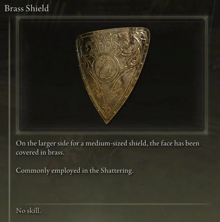 - 중간 크기의 방패 로 는 Scorpion Kite Shield, Black Leather Shield, Silver Mirror Shield, Inverted Hawk Heater Shield, Brass Shield 및 Carian Knight Shield 를 권장 합니다.