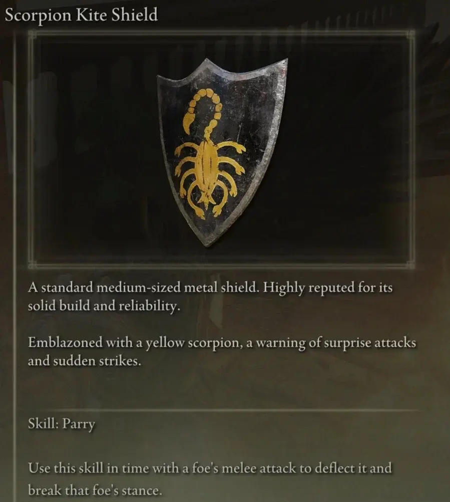전갈 연 방패는 전면에 황금 전갈의 상징이 있어 적을 위협하기에 충분합니다. 일반 소형 실드보다 크기 때문에 이 실드를 사용하려면 추가 강도 포인트가 필요합니다. 방패는 무게와 방어 사이의 적절한 균형을 특징으로 하며 Elden Ring 세계의 많은 전투 상황에 충분합니다. 그것은 이동성을 감소시키므로 고려해야 할 사항입니다. 손상을 줄이고 들어오는 공격을 차단하는 데 가장 효과적입니다.