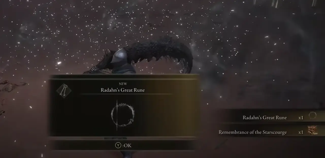 이 게임은 당신이 라단 장군을 물리치는 즉시 Lands Between의 특정 부분에서 상황이 바뀔 수밖에 없다는 미묘한 힌트를 제공합니다. 컷신이 나타나 유성우 와 거대한 섬광을 보여줍니다. 전장 근처에서 기다리고 있는 블레이드로 지금 서둘러야 할 때다.