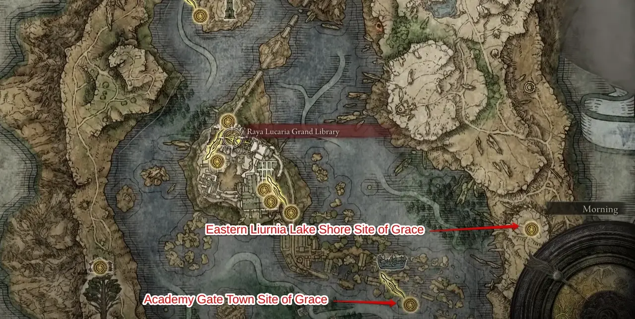 동부 리우르니아 호숫가 은총 유적지 남서쪽에 있는 아카데미 게이트 타운 은총 유적지 에서 직진하면 라야 루카리아 대도서관에 도착할 수 있다 . Elden Ring 지도의 다음 이미지는 잠재적으로 상황을 명확히 하는 데 도움이 될 수 있습니다.