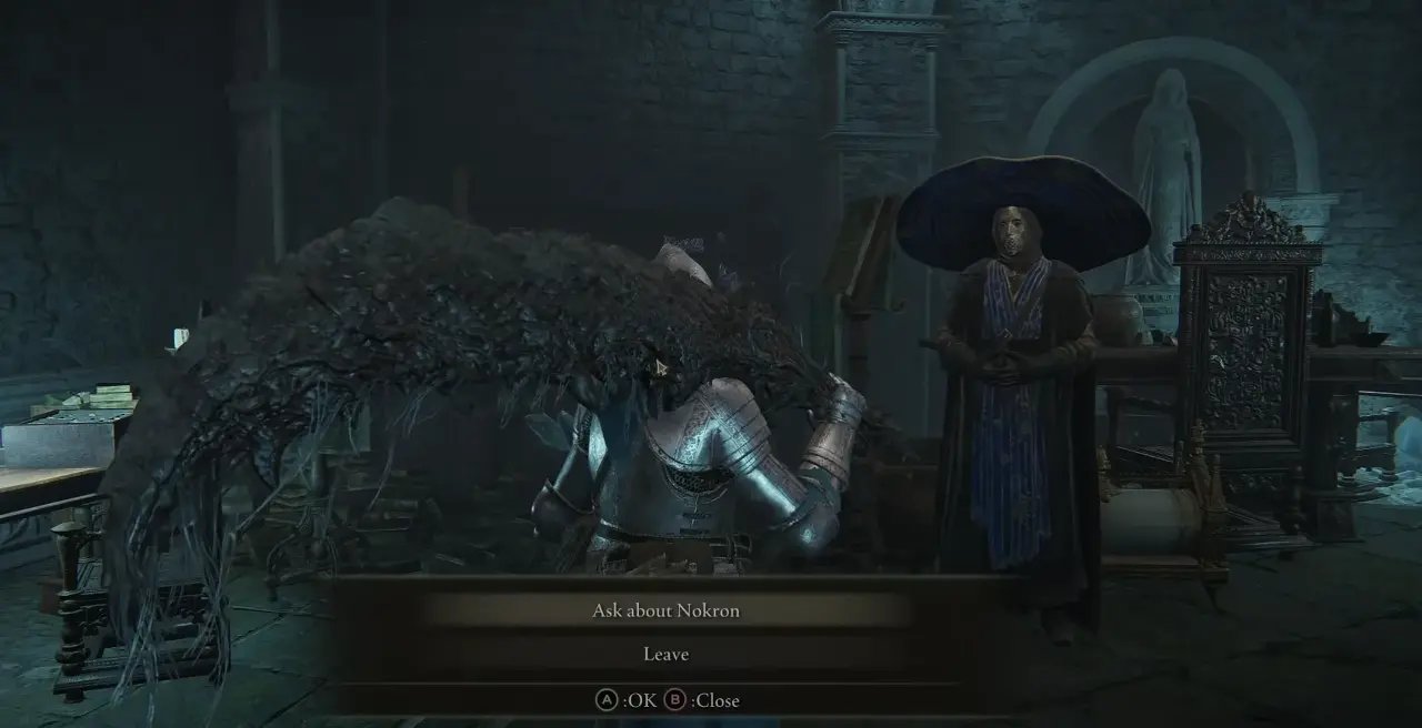 다음 단계는 셀루비스를 다시 방문하는 것입니다. Blaidd와 대화하면 처음부터 바로 이 작업을 수행하도록 유도해야 하지만 힌트를 얻지 못했다면 지금 서둘러야 할 때입니다. 그의 탑에있는 마법사에게 올라가면 그에게 말하십시오. 그는 처음에는 할당된 작업에 집중하는 것에 대해 꾸짖을 것이지만, Nokron에 대해 묻자 그는 의무를 다하기 시작할 것입니다.