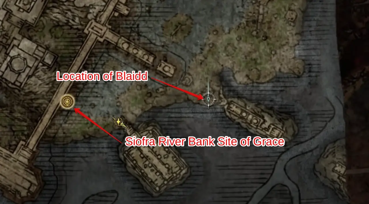 빠른 팁: 계단 아래에서 Siofra River 지도 조각도 찾을 수 있습니다. 거기에서 왼쪽으로 가면 결국 절벽 가장자리 근처에 서있는 Blaidd를 볼 수 있습니다. 다음 스테이지로 넘어가기 전에 반늑대 전사와 두 번 대화해야 합니다.