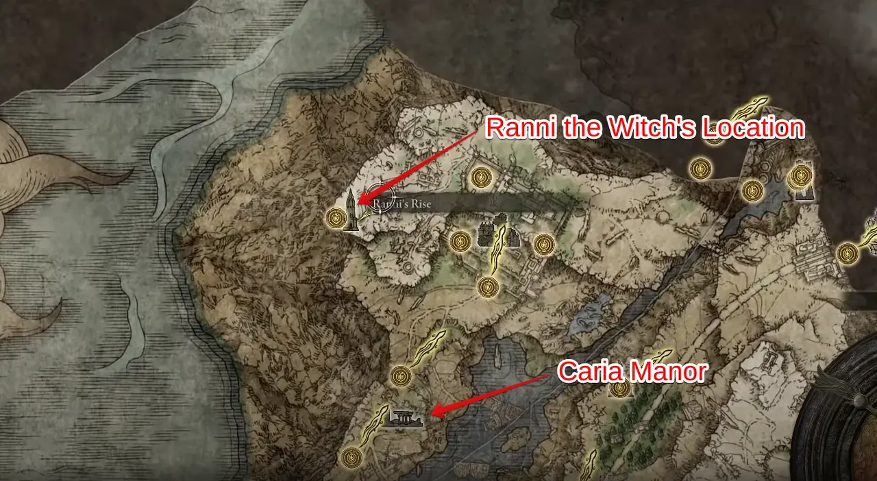 마녀 라니의 메인 퀘스트를 시작하려면 그녀와 대화해야 합니다. 그녀는 Liurnia of the Lakes의 Three Sisters 하위 지역 서쪽에 있는 Ranni's Rise 에 있습니다. 아직 Liurnia에 도착하지 않은 경우 시간을 투자 하여 게임 튜토리얼을 종료한 후 가장 먼저 발을 딛는 지역 인 Limgrave 의 북서쪽으로 향하는 것을 권장합니다.