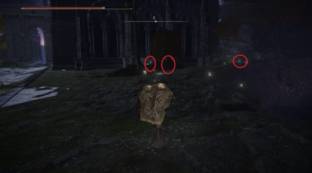 Ghost-Glovewort Picker's Bell Bearing [1] , 근처의 적과 함께. 근처에 몇 명의 근접 적들이 더 있고 북쪽에는 두 명의 궁수가 더 있습니다.다시 한 번, 여기에서 한 번에 모든 적과 싸우는 것을 피하기 위해 잠입할 수 있습니다.— 아무도 모르게 정자 옆에서 물건을 잡을 수도 있습니다. 다음으로 정자 너머 건물 사이의 틈으로 이동합니다.