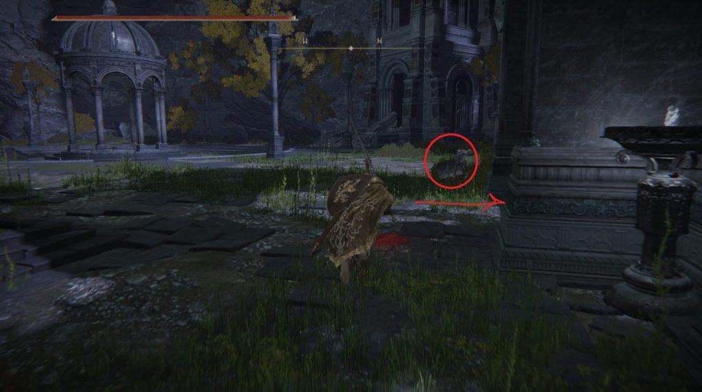 황금의 룬[7] 은 계단의 맨 아래를 지나서야 나옵니다. 더 남동쪽으로 계단을 올라오는 녹스 여검은 강적이며, 백업으로 은빛 눈물을 가지고 있습니다. 원한다면 남쪽으로(그녀가 올라오는 계단의 오른쪽으로) 내려가서 그녀를 피할 수 있습니다. 벽이 부서진 곳. 아래 섹션의 정자에는 다른 시체가 있습니다.