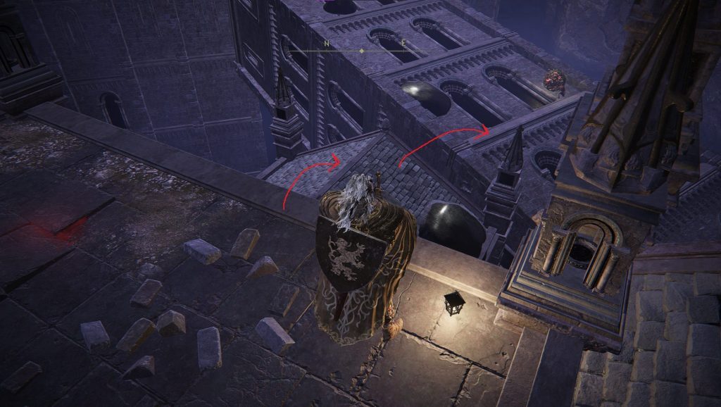초기 나비 — 거기에서 북서쪽 근처 지붕으로 점프할 수 있습니다. 북쪽 지붕을 따라가다가 끝나면 아래 난간으로 내려갑니다. 난간이 끝날 때까지 북쪽으로 계속 가십시오. 그곳에서 좌회전하여 창문을 통해 점프할 수 있습니다.