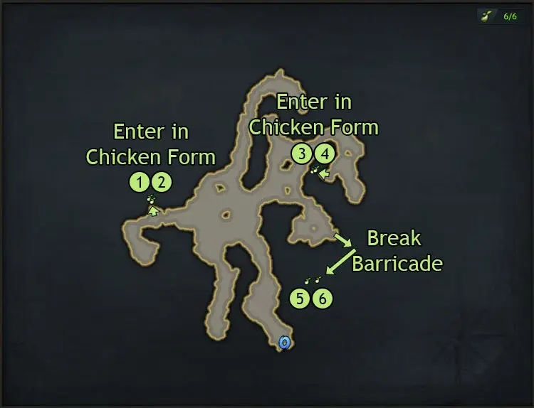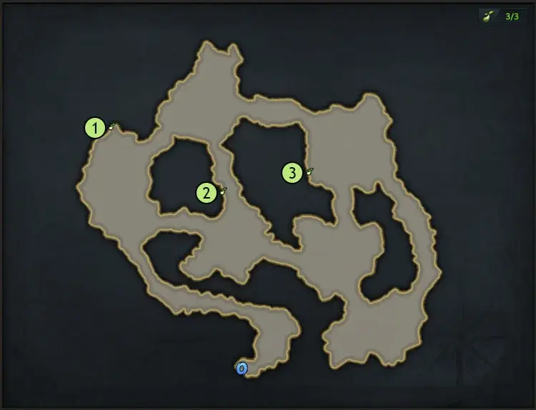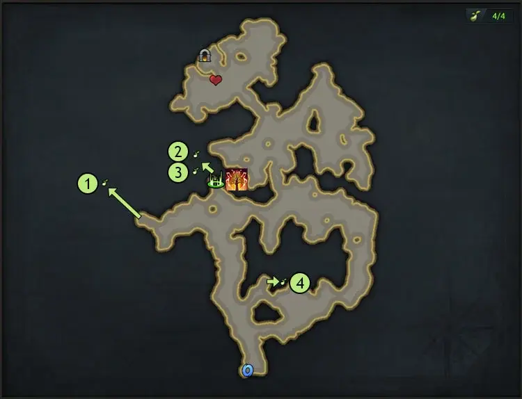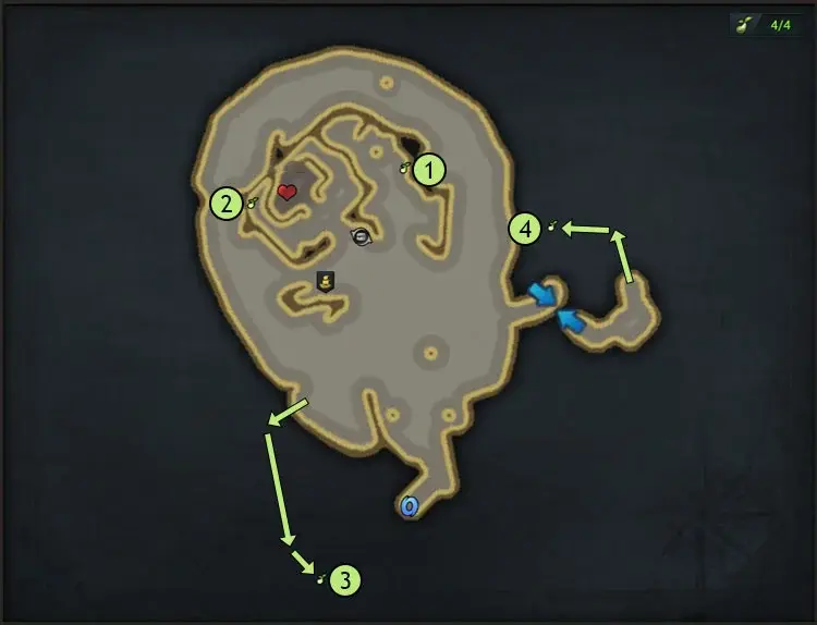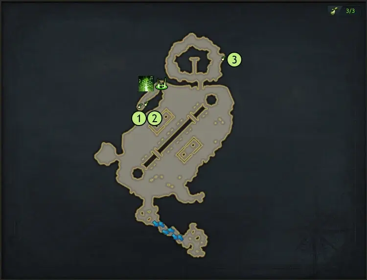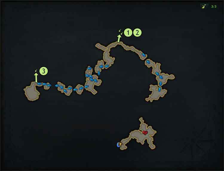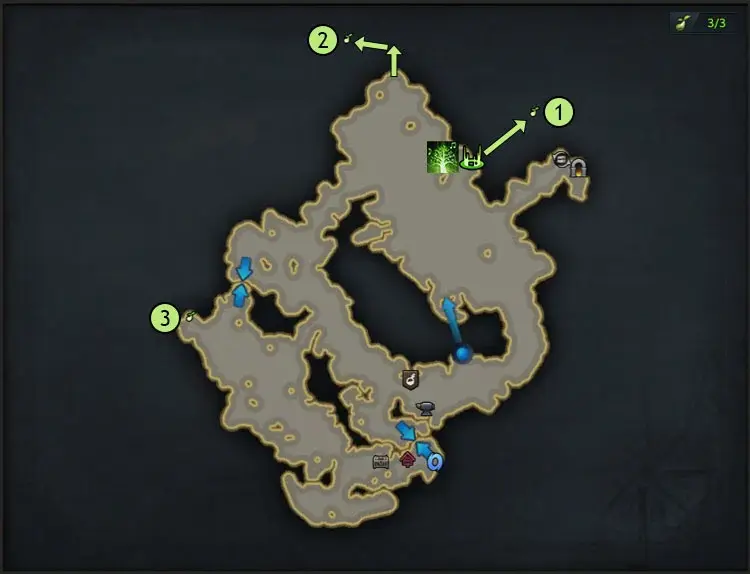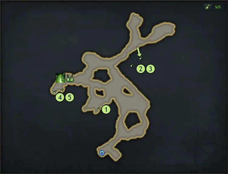 지도의 빈 공간에 있는 세 개는 묘지의 남서쪽 모서리로 이동하여 환경 마커와 상호 작용하여 절벽 면을 올라가면 접근할 수 있습니다. 두 개의 씨앗은 깨진 알이 있는 둥지 근처 지역의 뒤쪽에 있고 세 번째 씨앗은 그 둥지에서 남서쪽으로 약간 떨어진 나무 아래에 있습니다.