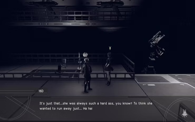 16D에게 11B가 탈영할 계획이라고 말하면 16D는 다소 냉담해 보이고 11B가 그녀에게 얼마나 엄격했는지를 회상하고 도망친 것에 대해 11B를 조롱합니다. 이상하게도 그녀는 당신의 대답에 행복해 보이지만 다소 불안해 보입니다.