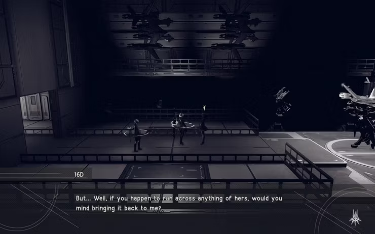 "Retrieve Data" 임무를 완료한 후 레지스탕스 캠프 릴레이에서 이동하여 벙커로 돌아온 다음 격납고로 이동하여 16D와 채팅하여 이 새로운 사이드 퀘스트를 활성화하십시오( 그림 1-2 ).