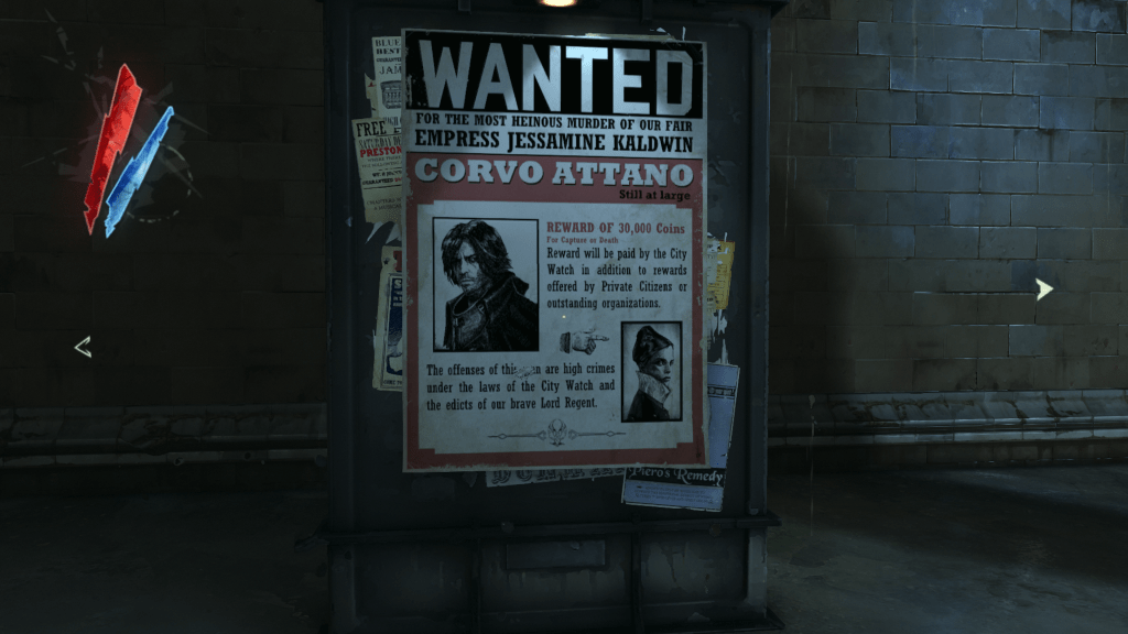Corvo는 초기에 천천히 확장되는 일련의 도구를 제공받습니다. 처음에는 검, 총, 활이 있습니다. 이러한 무기를 결합하여 최대의 혼돈을 일으키거나, 조용히 적을 제거하는 데 사용하거나, 모두 무시하고 치명적이지 않은 플레이 스타일에 집중할 수 있습니다. 이러한 표준 무기와 함께 손이 닿지 않는 지역으로 순간이동하는 능력, 투명 벽, 시간 감속 등 다양한 초자연적 능력이 있습니다.