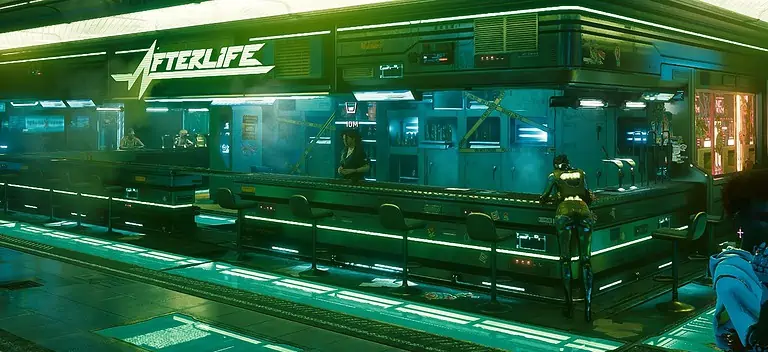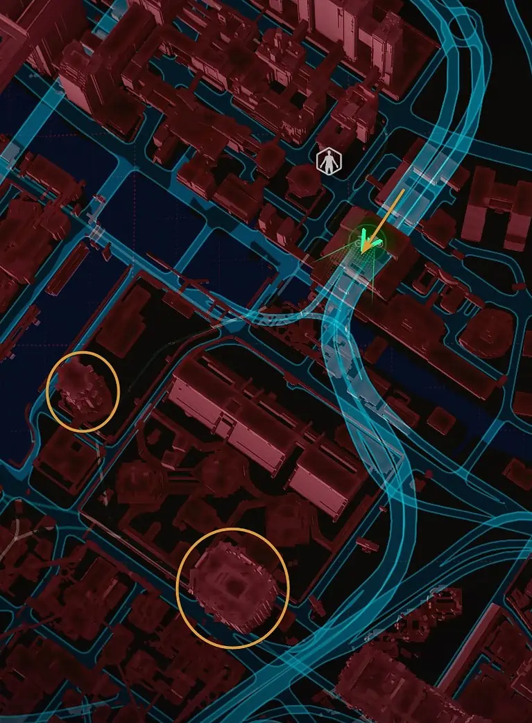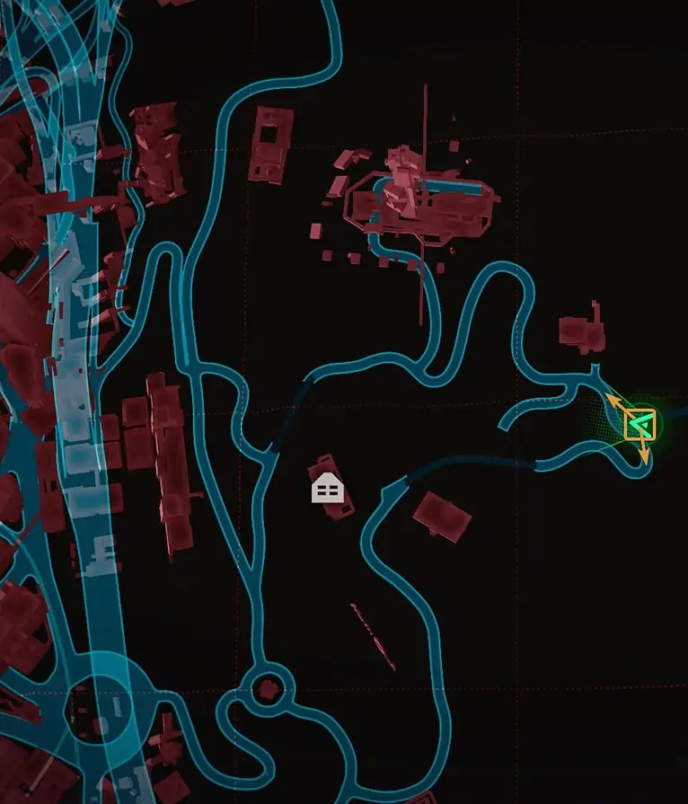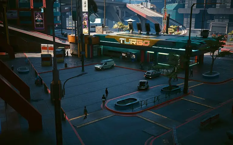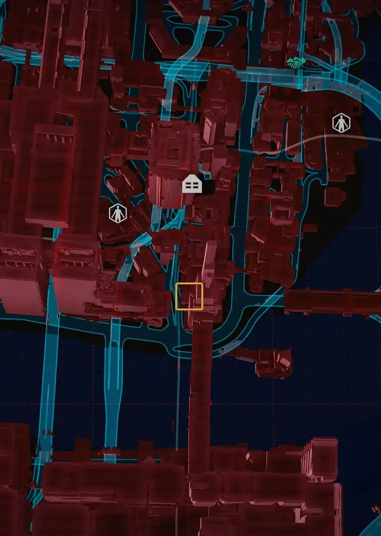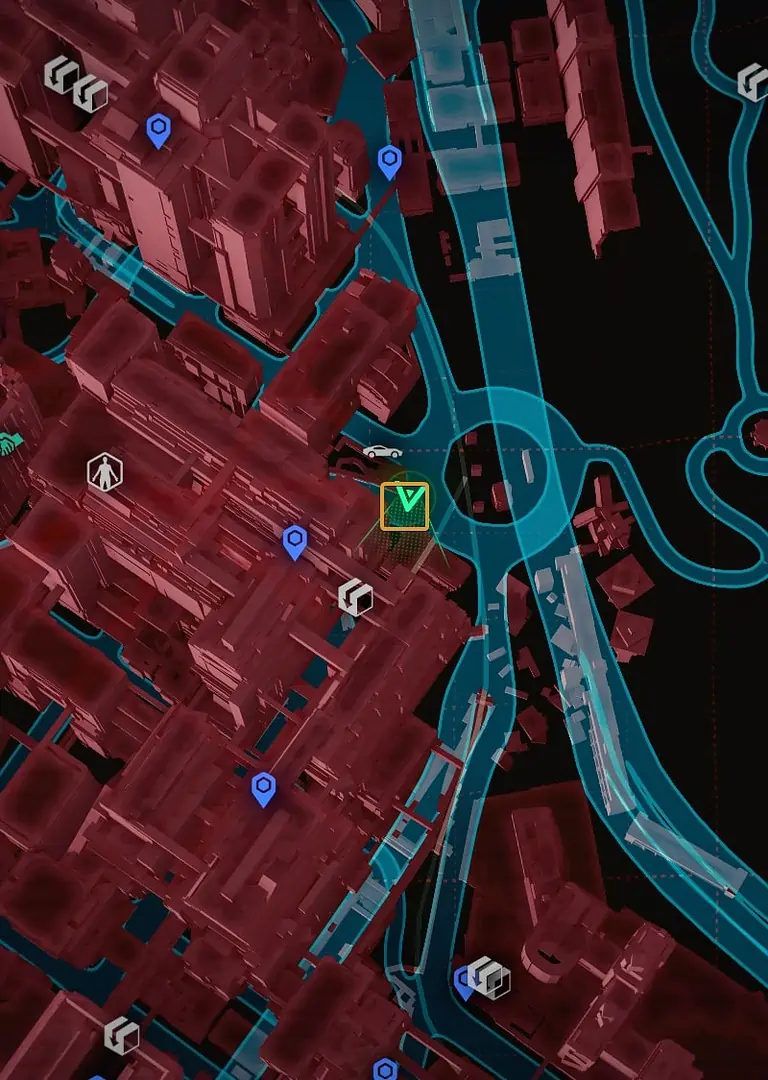Night City의 서쪽, City Center의 Downtowm 지역에서 Lucy와 David가 저녁 달리기를 하는 정확한 위치를 찾을 수 있습니다.