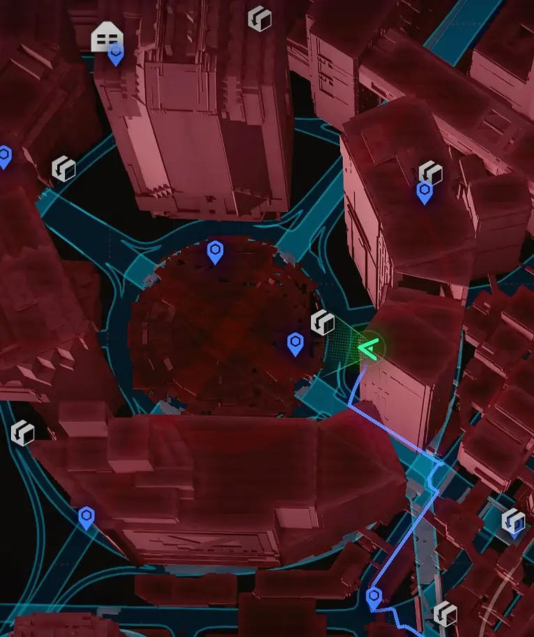 이것은 남쪽으로는 의회 및 MLK 지하철역, 북쪽으로는 Delamain HQ에서 멀지 않은 대형 빌딩 단지 아래의 거리입니다. 지도에는 바 안에 있는 내 캐릭터가 표시됩니다.