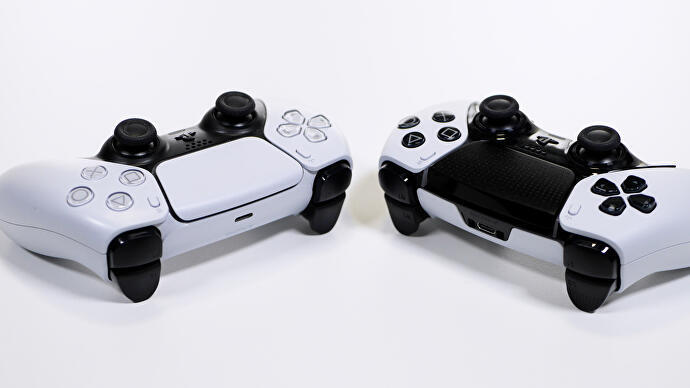 DualSense Edge(오른쪽)는 검은색 버튼, d-패드 및 트랙패드 덕분에 원본과 즉시 구별됩니다.