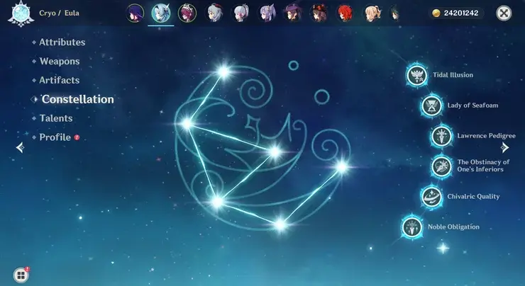 - C6: 이 별자리는 완전 미쳤어. 이를 통해 Eula는 콤보로 버스트에 대해 훨씬 더 많은 스택을 생성할 수 있습니다. Eula의 Elemental Burst는 피해를 30중첩으로 제한하며 C6만이 해당 임계값에 도달할 수 있는 유일한 방법입니다.
