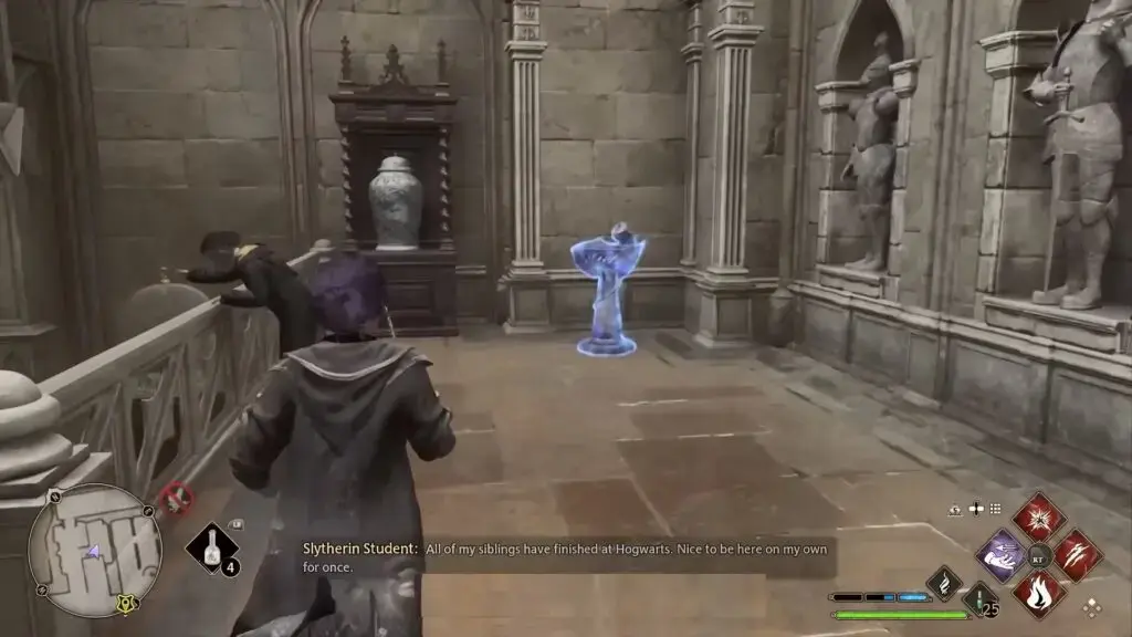 Library Floo Flame으로 빠르게 이동합니다. 위층으로 올라가 빨간 옷을 입은 남자의 큰 그림 앞에서 Revelio를 캐스팅하십시오.