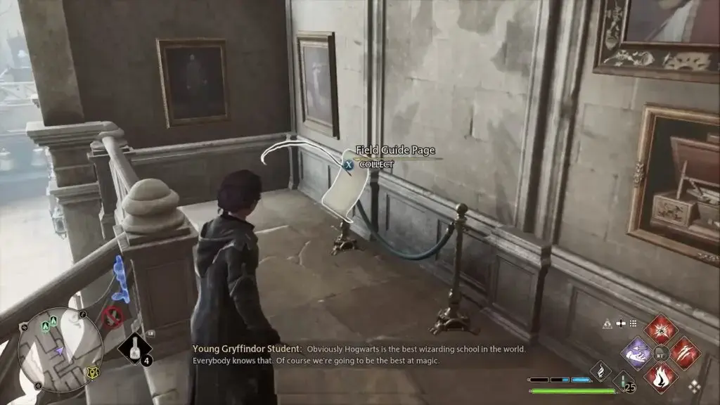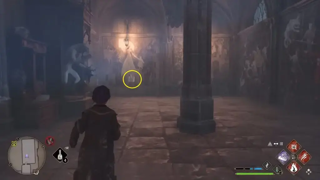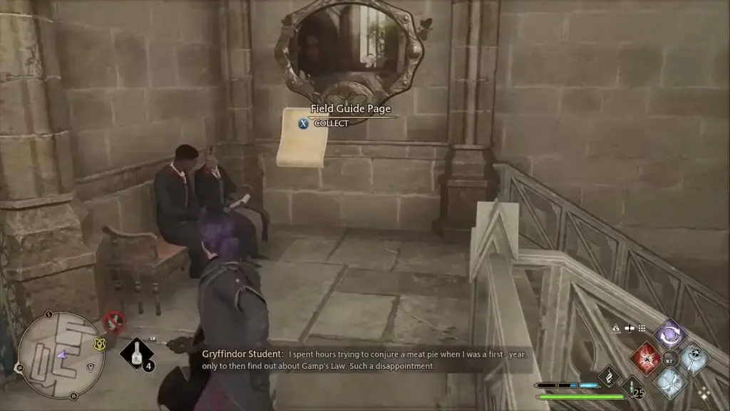 Bell Tower Courtyard Floo Flame으로 빠르게 이동합니다. 계단을 왼쪽으로 꺾은 다음 몇 개의 초상화가 있는 벽에 도달하도록 왼쪽으로 가십시오. 검게 그을린 마법사의 윤곽을 발견하고 Revelio를 시전하여 Field Guide Page를 불러옵니다.