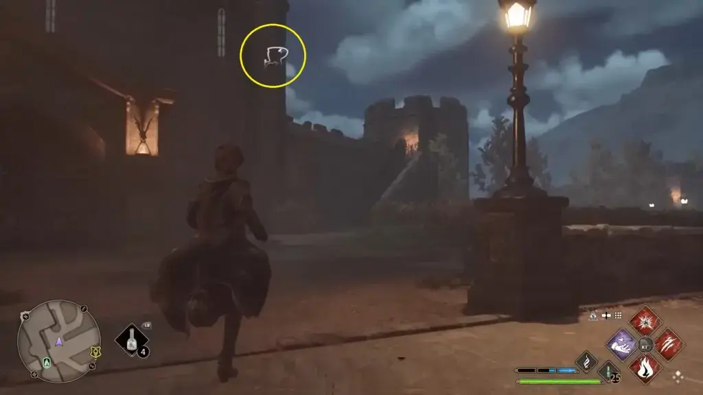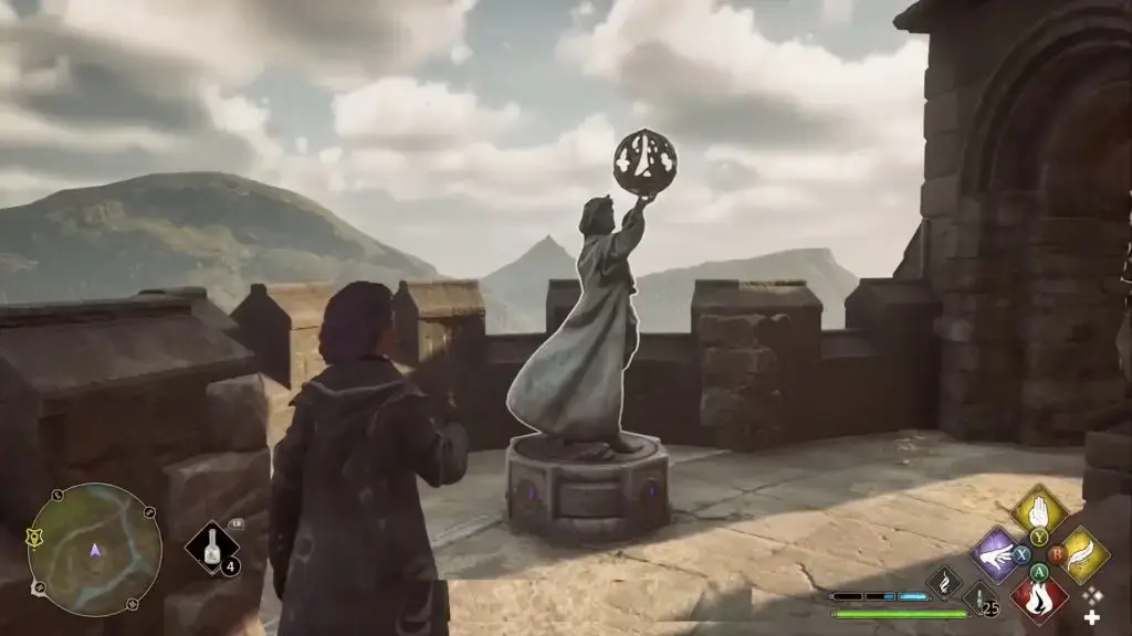 부엉이(부엉이 탑) 근처의 사다리를 타고 올라가면 성이 내려다보이는 조각상을 찾을 수 있습니다. 필드 가이드 페이지를 표시하려면 지구본에 Levioso를 캐스팅하세요.