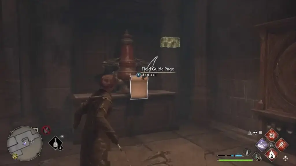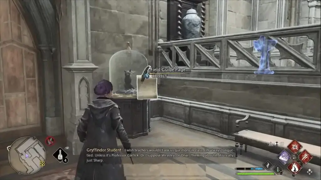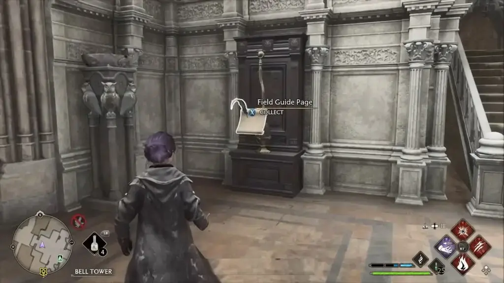Bell Tower Courtyard Floo Flame으로 빠르게 이동합니다. 두 개의 날이 달린 무기가 들어 있는 진열장을 찾으려면 왼쪽 계단을 올라가세요. Revelio를 시전하여 필드 가이드 페이지를 표시하십시오.