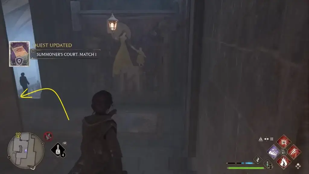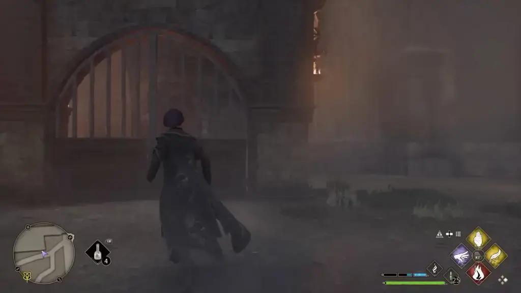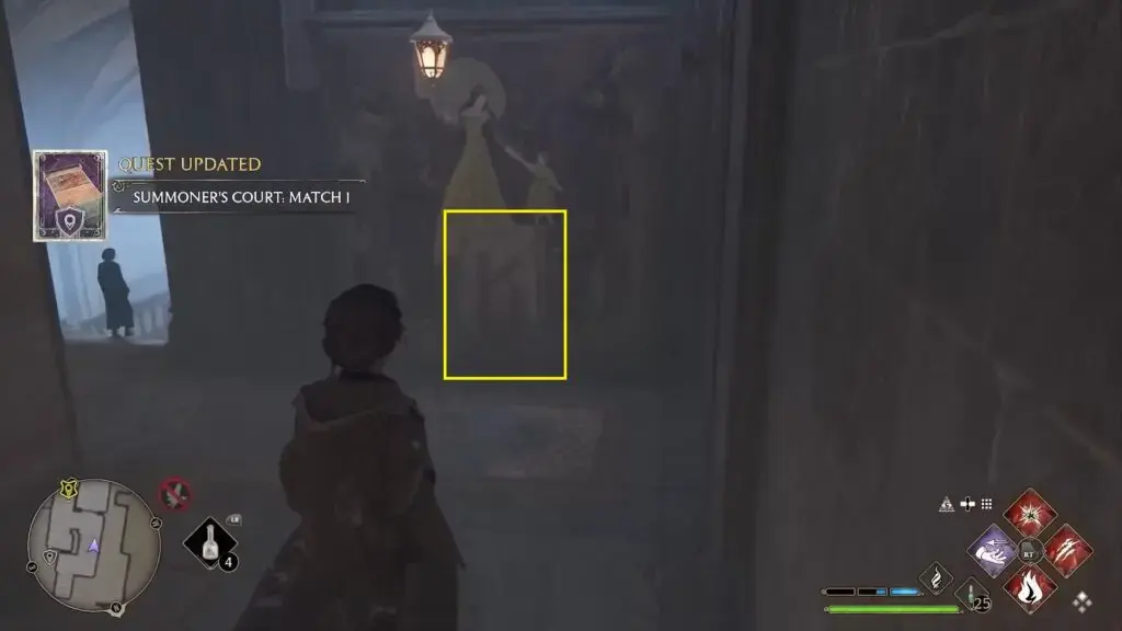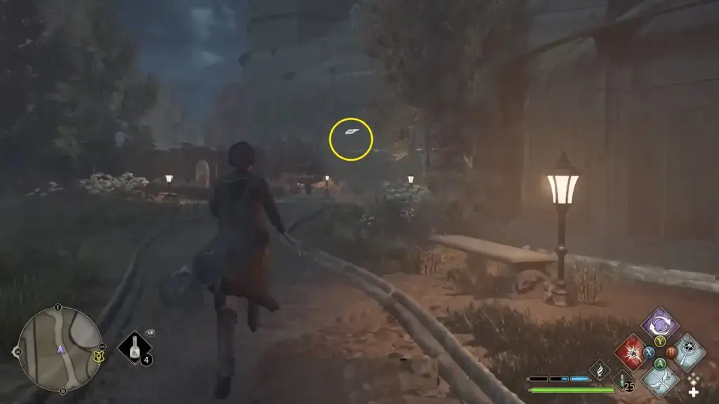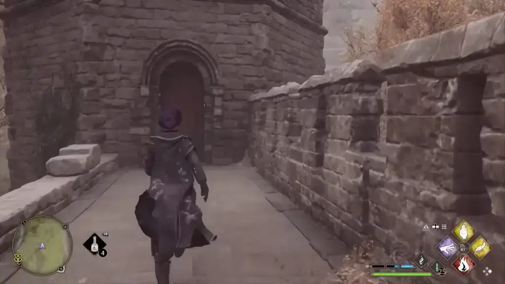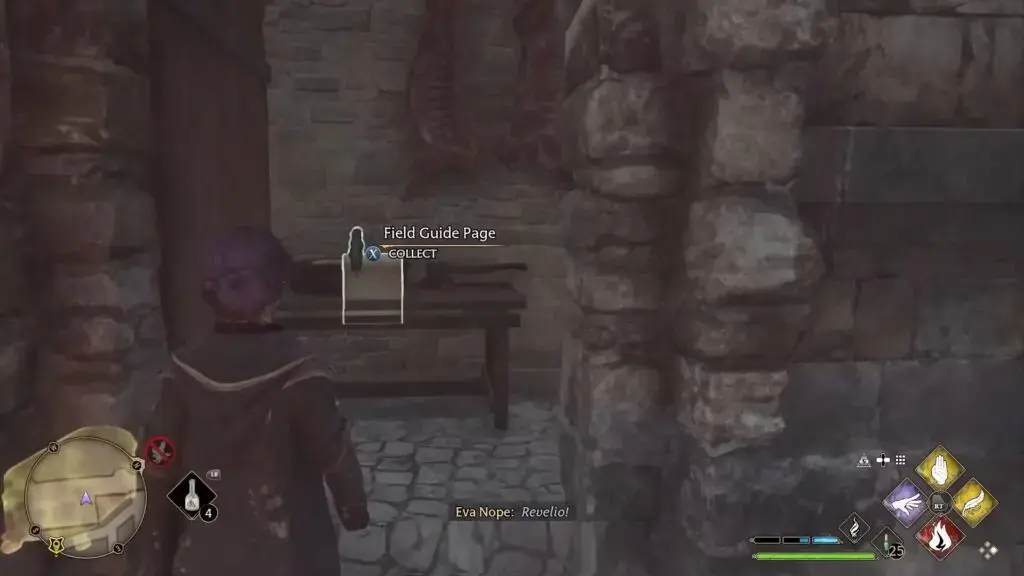 Hogwarts 북쪽 출구 Floo Flame으로 빠른 이동. 아치형 통로를 지나 우회전하여 성벽을 따라갑니다. 네 번째 탑에 들어가 Revelio를 시전하여 현장 안내 페이지를 표시하세요.