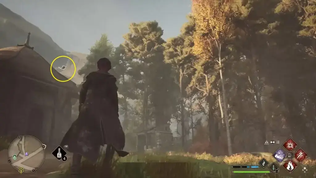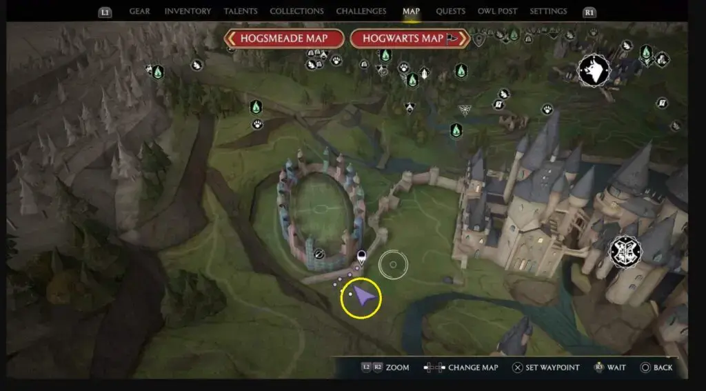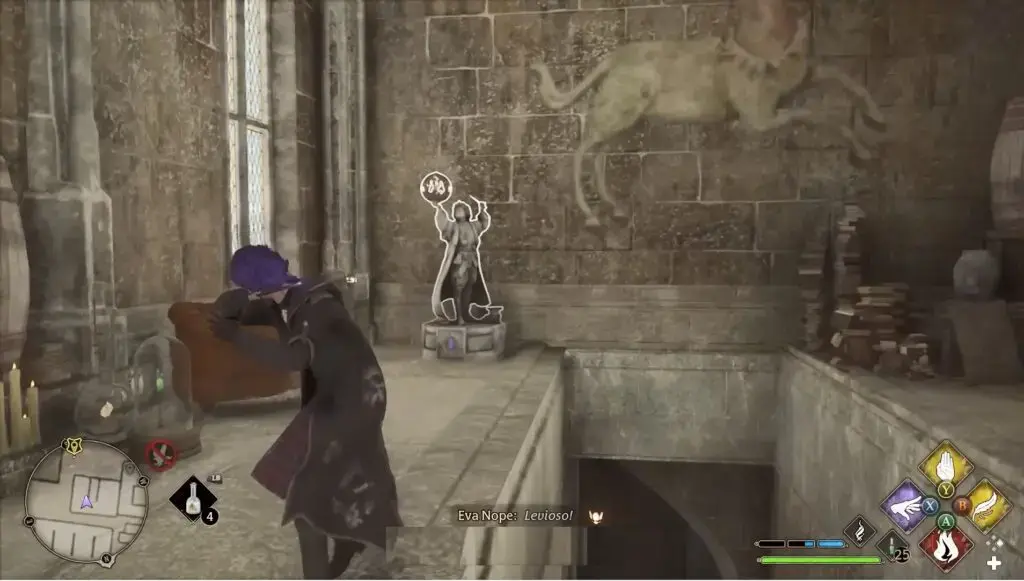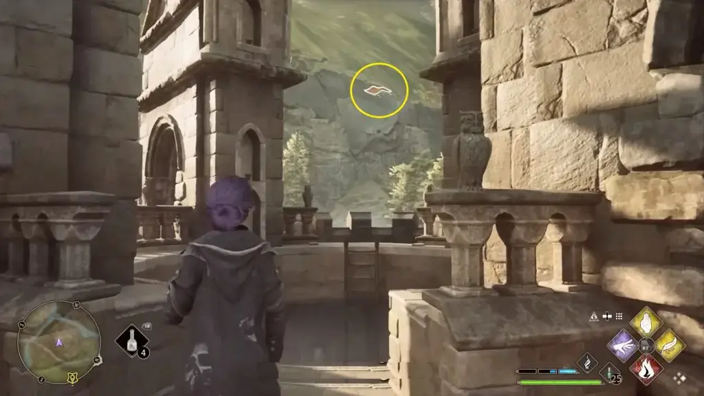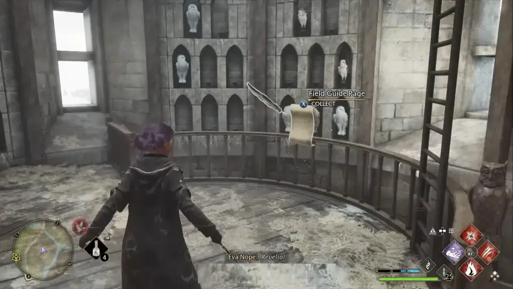 위의 지도에 표시된 대로 Owlery 타워로 향합니다. 건물 안으로 들어가 계단을 올라갑니다. 부엉이 조각상 근처에서 Revelio를 시전하여 Field Guide Page를 드러내세요.