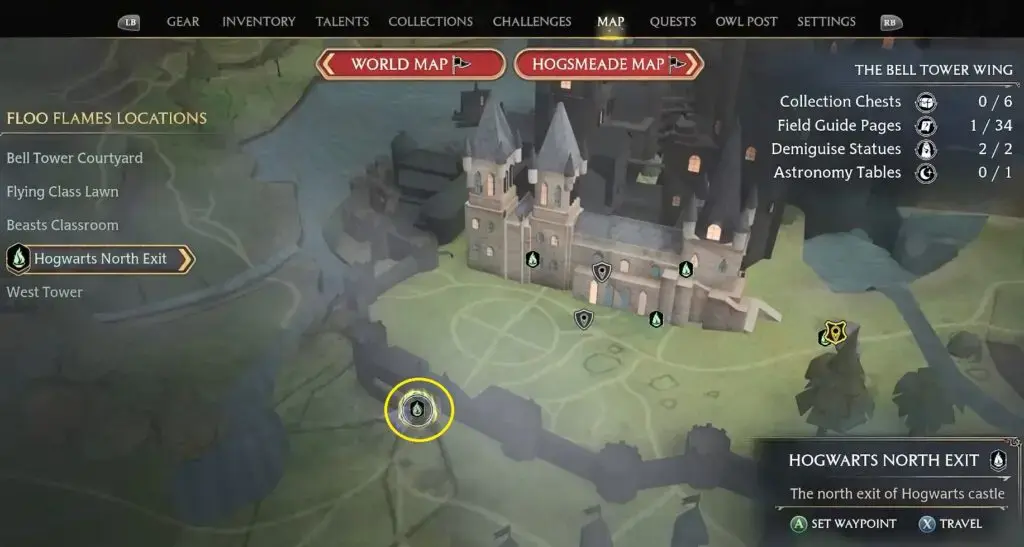 Hogwarts 북쪽 출구 Floo Flame으로 빠른 이동. 정문 위의 방으로 가십시오. 왼쪽의 성벽(벽)을 따라 첫 번째 계단을 타고 몇 개의 문을 통과하면 위치에 도달할 수 있습니다. 안으로 들어가시면 조각상이 있습니다. Field Guide Page를 나타내기 위해 지구본에 Levioso를 캐스팅하십시오.