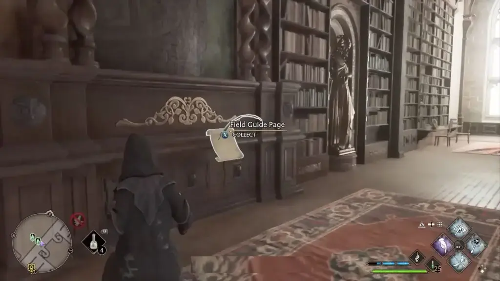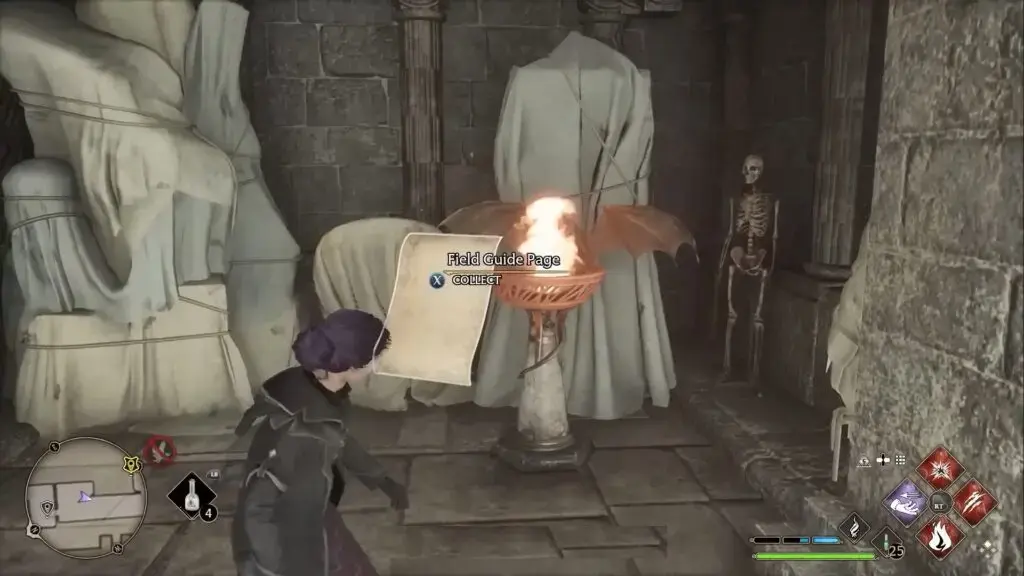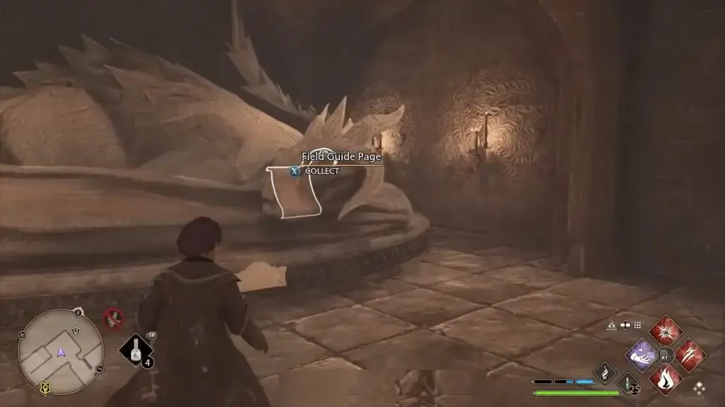 왼쪽에 있는 큰 용 조각상에 도달할 때까지 마지막 수집품(K 태피스트리를 지나)에서 왼쪽으로 아래층으로 가십시오. Revelio를 시전하여 필드 가이드 페이지를 표시하십시오.
