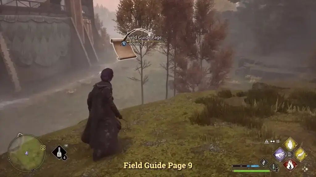 지도에 표시된 장소로 이동합니다. 부서진 성벽 부분이 보입니다. 성벽과 퀴디치 경기장 사이의 잔디 난간에서 Revelio를 캐스팅하여 필드 가이드 페이지를 표시합니다.