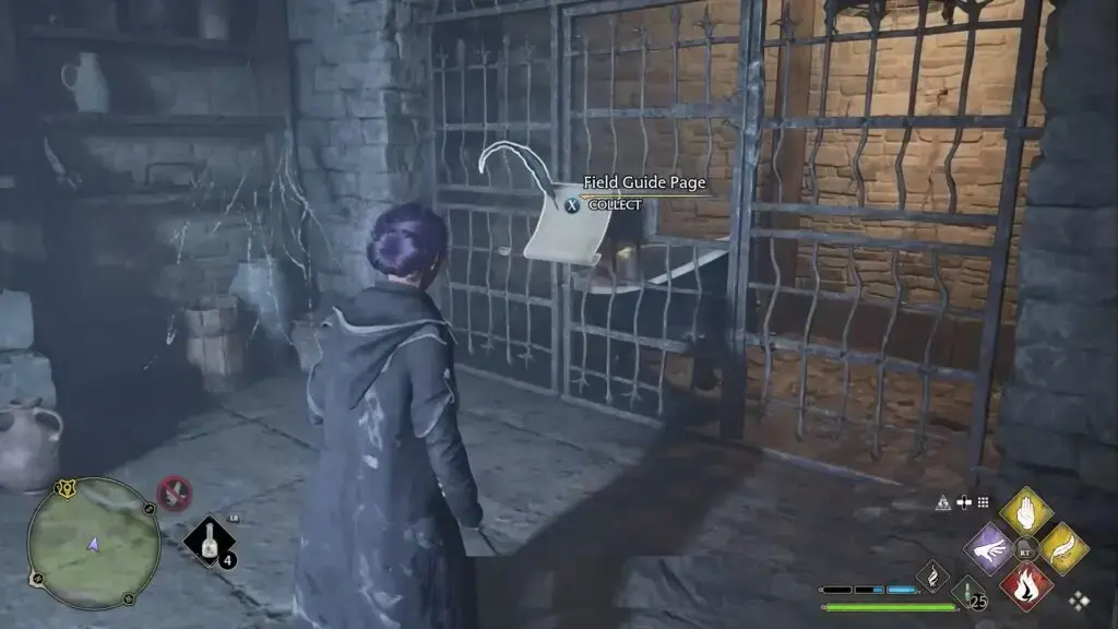 Bell Tower Courtyard Floo Flame으로 빠르게 이동합니다. 왼쪽에 있는 계단을 계속 올라가 앞의 문을 통해 지하 감옥으로 내려가십시오. K가 있는 커다란 태피스트리를 만날 때까지 계속 내려가세요. 비밀 방에 입장하려면 K를 통해 오른쪽으로 걸어가십시오. 동상이 늘어선 복도 끝의 문을 통과하십시오. Field Guide Page를 발견하려면 가장 왼쪽 태피스트리에 Revelio를 캐스팅하십시오.