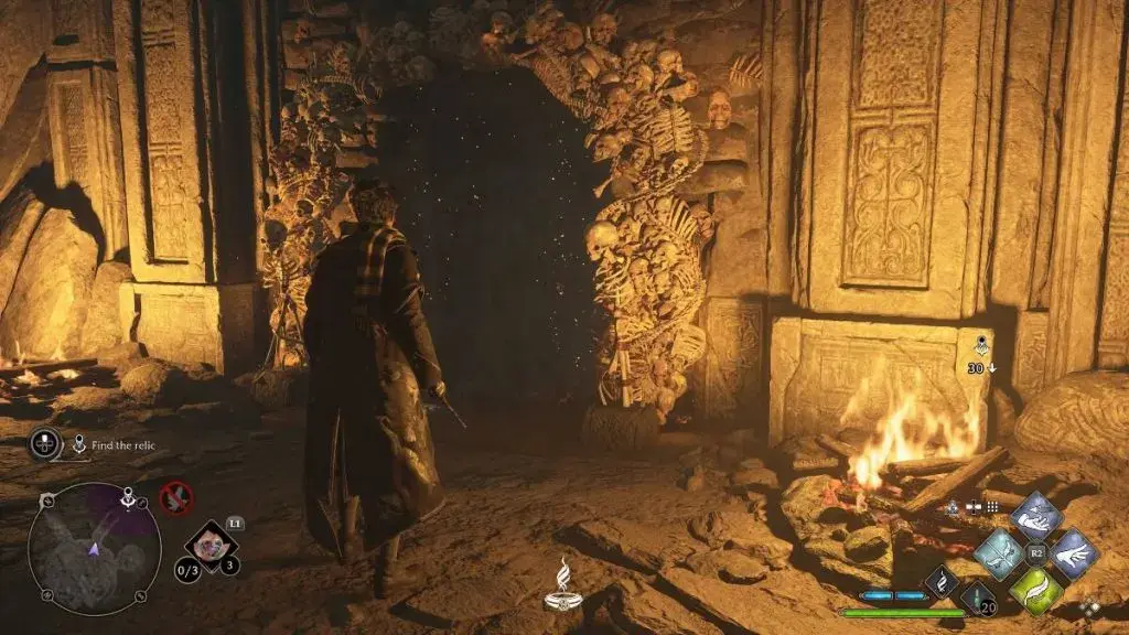 - 이것을 열려면 Wingardium Leviosa로 세 개의 뼈 더미를 바리케이드로 이동하여 아치를 만들어야 합니다.