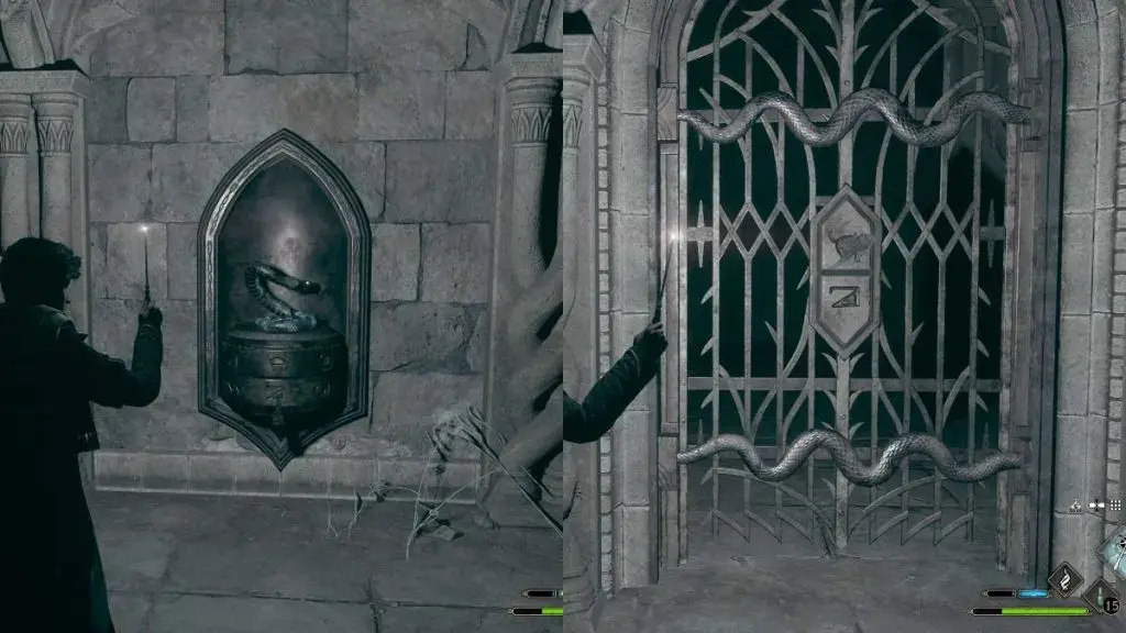 - Ominis Gaunt와 대화하여 파셀통그를 말하여 뱀의 문을 열게 하십시오.
